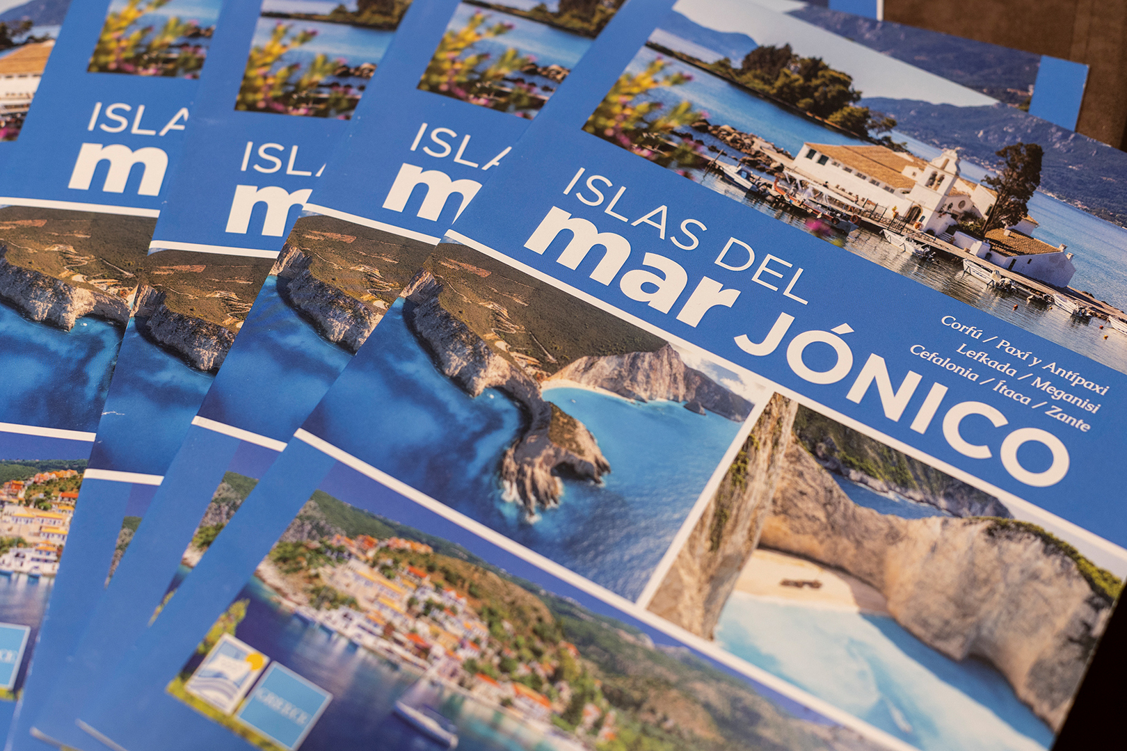 Corfú, con su arquitectura veneciana y más de doscientos kilómetros de costa; Paxí, íntima y boscosa; Leúcade, la «perla del Mar Jónico»; Cefalonia, la «isla de la alegría»; Ítaca, patria legendaria de Ulises, y Zante, icono ecoturístico gracias a su Parque Marítimo Nacional y las tortugas caretta-caretta… La presentación estableció cada una de las islas como un capítulo distinto de un mismo relato mediterráneo.